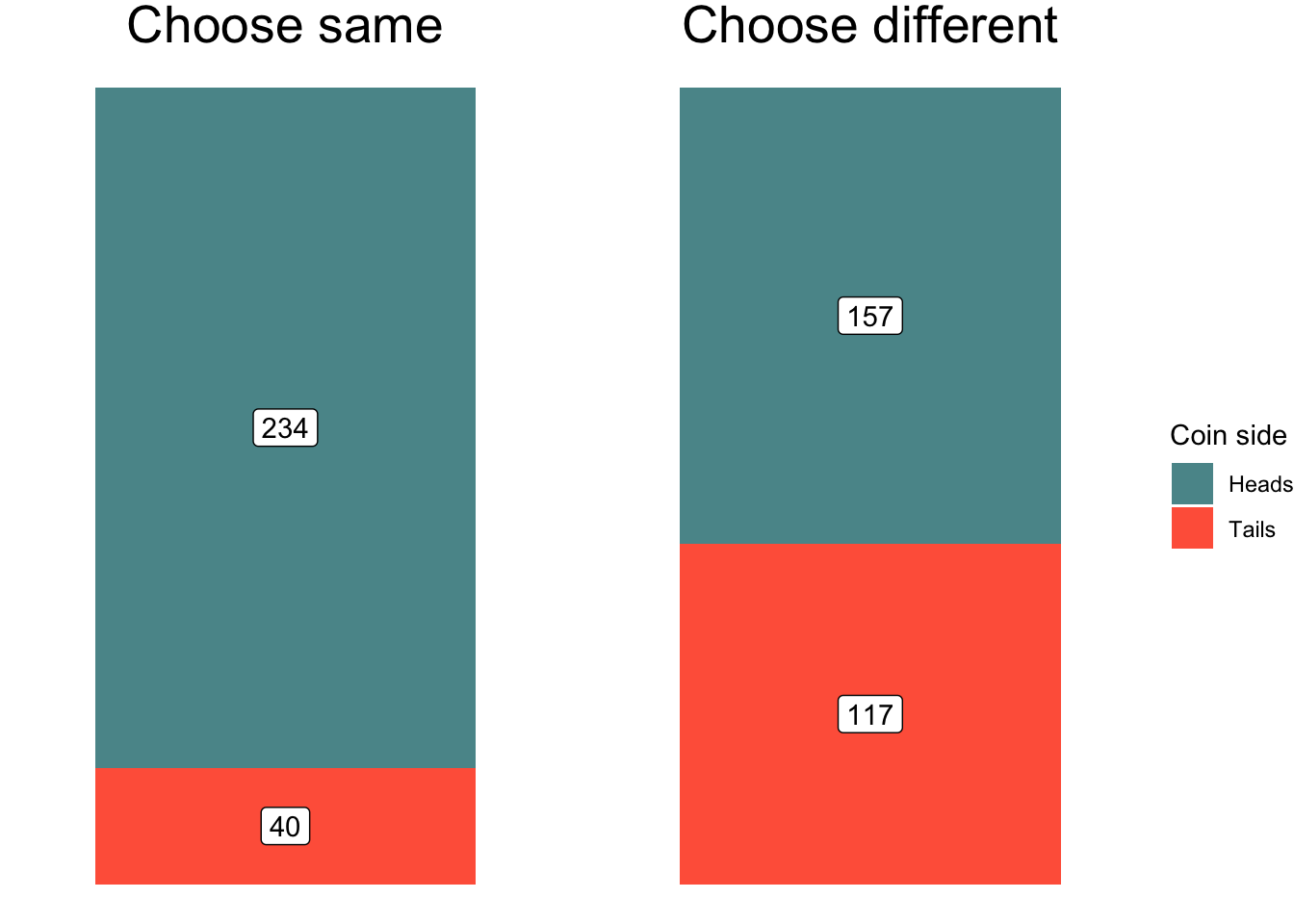 We constructed a survey modeled after Schelling’s original report. Schelling himself did not perform a true “study” in reporting his results, but rather loosely surveyed the graduate students in his class at Yale in the 1950s (precise year unclear). Our data collection was similarly gathered quite loosely. The survey data were collected with the intention of serving a pedagogical purpose and with no intention to be published as rigorous study. While we cannot use these data to make empirical claims, they are nonetheless a useful and thought-provoking educational tool (as Schelling’s data certainly were).
