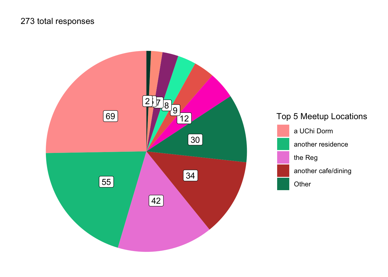 The Reg was the most common response for where to meet an unfamiliar UChicago student in Chicago, but only 42 respondents (15.38%) chose to meet a close UChicago friend at the Reg.