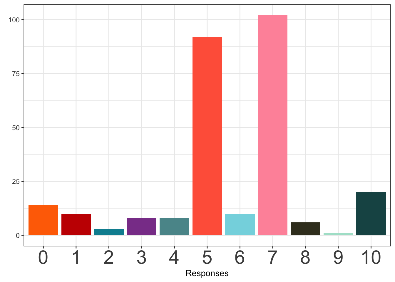 When picking a number 0-10, the most popular response was 7, chosen by 102 participants (37.23%).