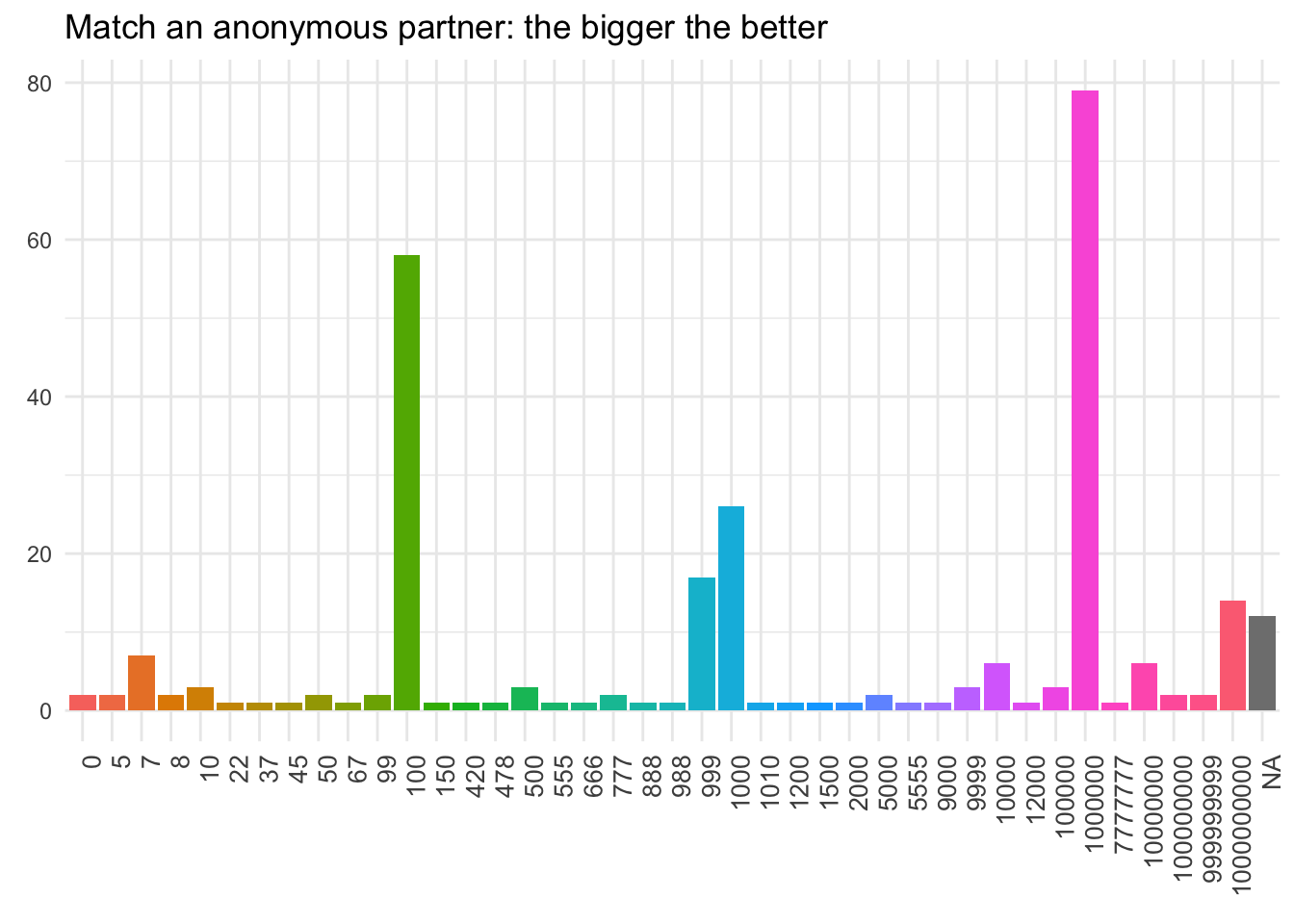 When selecting any number with the goal of converging on the biggest possible number, the most popular response was 1,000,000, chosen by 79 participants (28.83%).