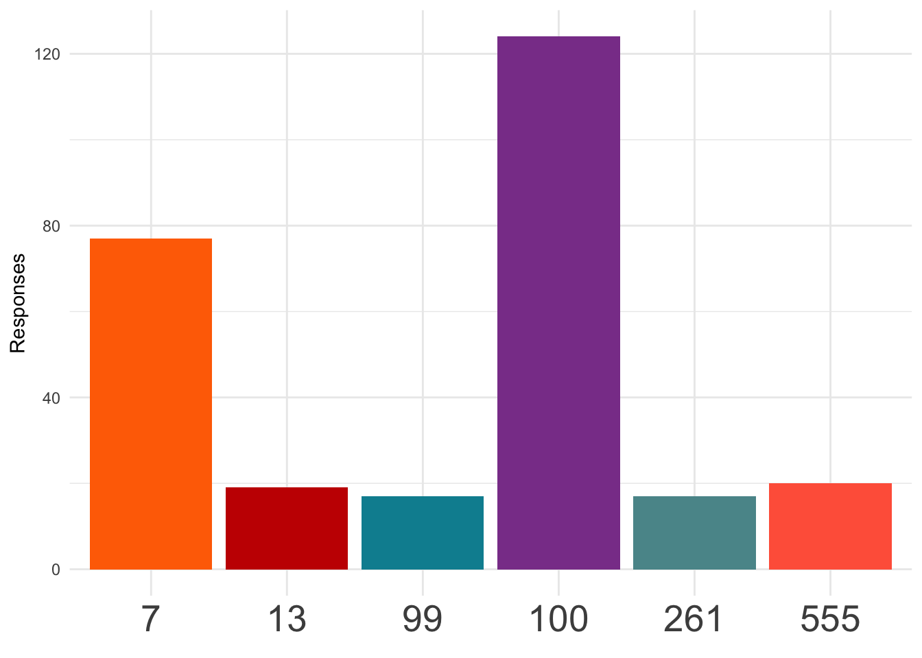 When selecting a number from the set, the most popular response was 100, chosen by 124 participants (45.26%).