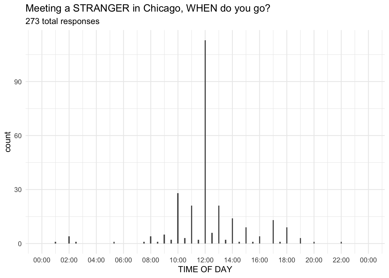 The most common response for where to meet an unknown UChicago student in Chicago was the Reg, with 120 responses (44.94%). By comparison, only 20 respondents (8.62%) chose to meet a stranger at the Reg.