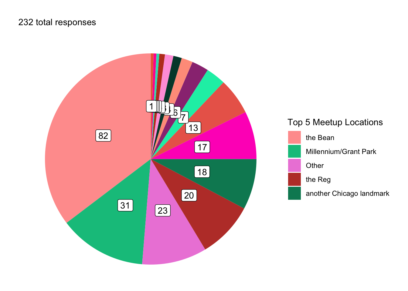 The most common response for where to meet a stranger in Chicago was the Bean, with 82 responses (35.34%).