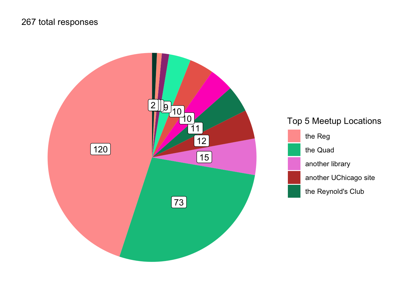 Responses have been cleaned to account for predictable variations in how individuals input popular responses – e.g., “the reg”, “Regenstein”, and “In the Reg.” are all reported as “The Reg.” Ambiguous responses (e.g., “the library”) are left ambiguous. Responses that indicated clear misunderstanding of the question are excluded1 and some responses were coded as “Other” when necessary.2
